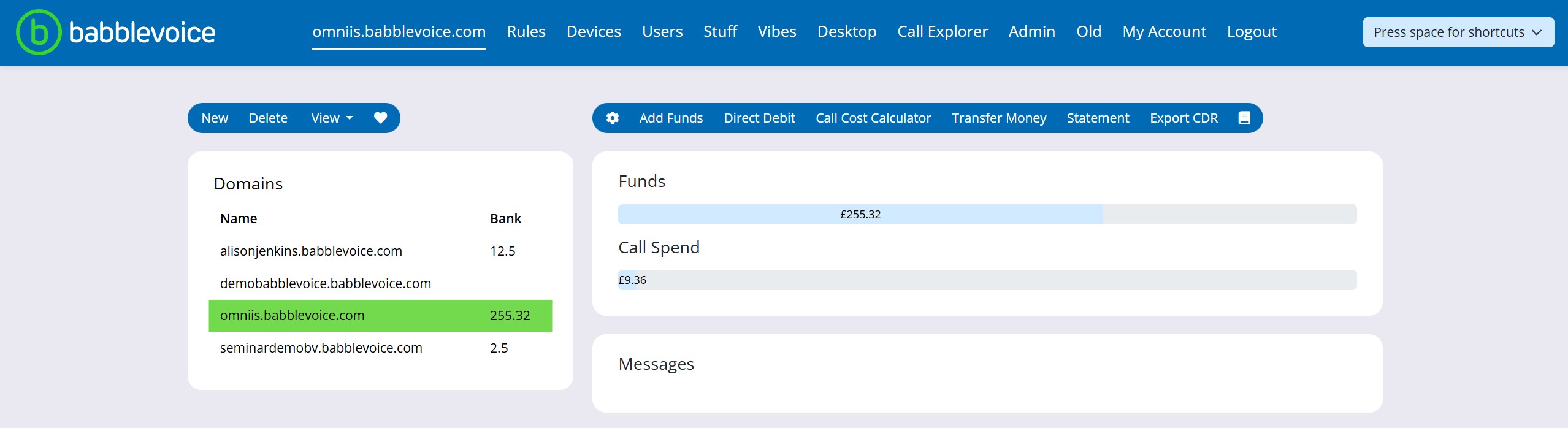 You can see at a glance the funds left on the domain and the call spend bars. These will change colour - red if you are running out of funds, through to orange and then blue if you have plenty of money.